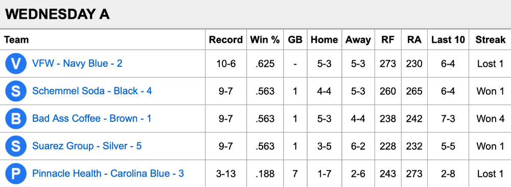 | Team | Record | Win % | GB | Home | Away | RF | RA | Last 10 | Streak |