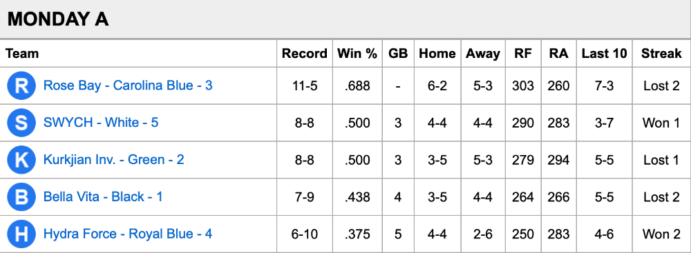 | Team | Record | Win % | GB | Home | Away | RF | RA | Last 10 | Streak |