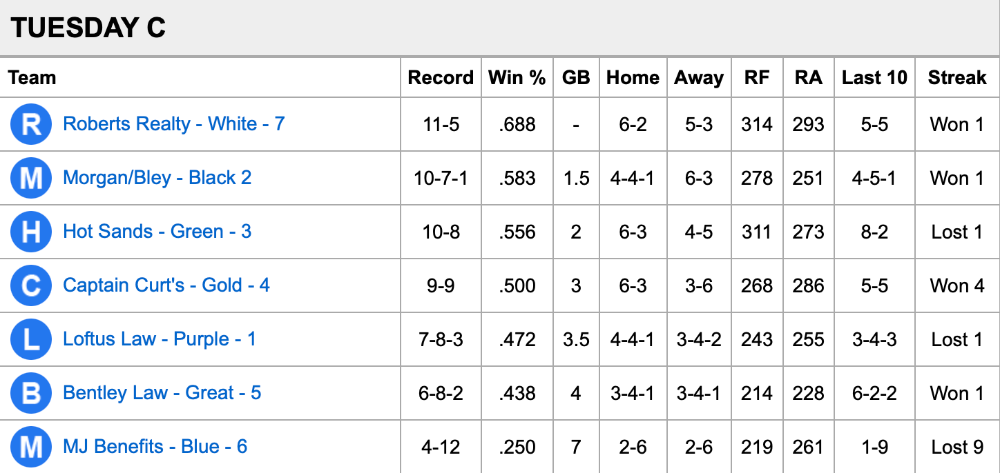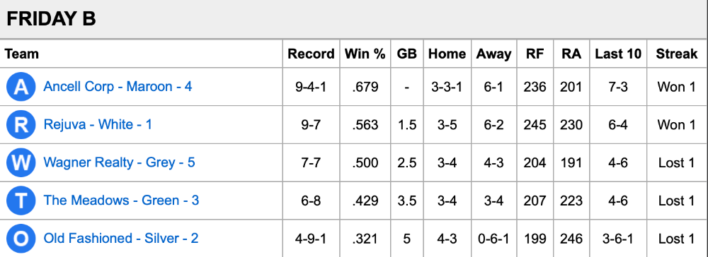 Wagner Realty - Gray - 1 | 1-1 | .500 | - | 1-0 | 0-1 | 30 | 26 | 1-1 | Lost 1 |
